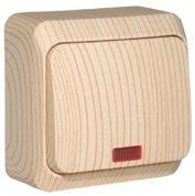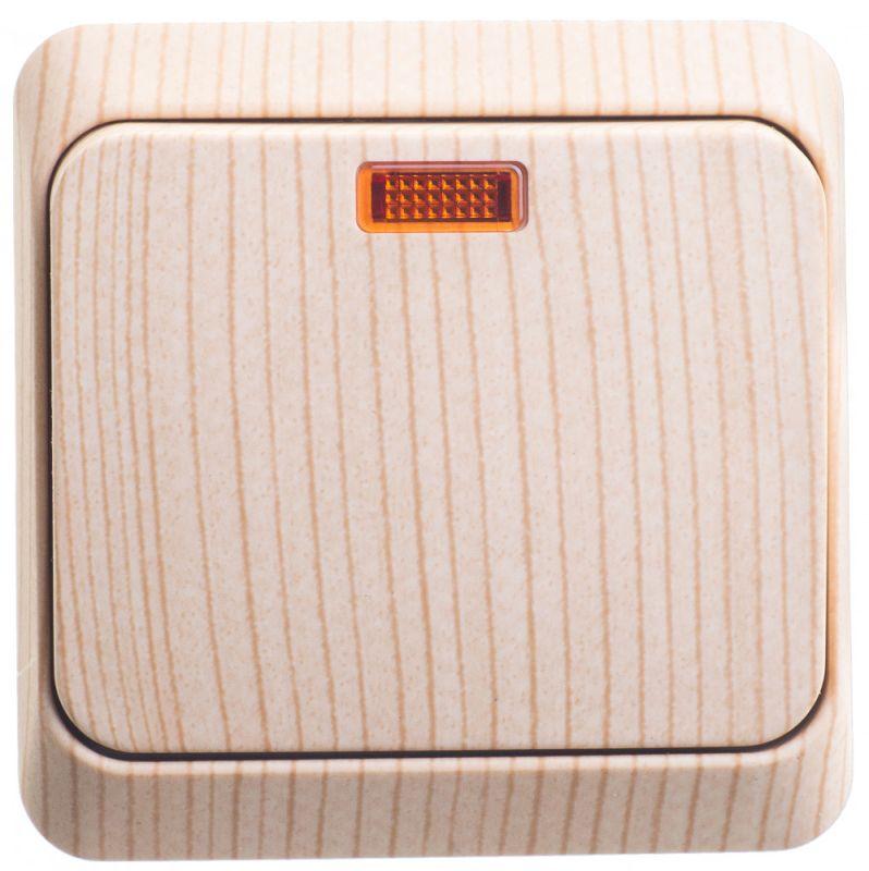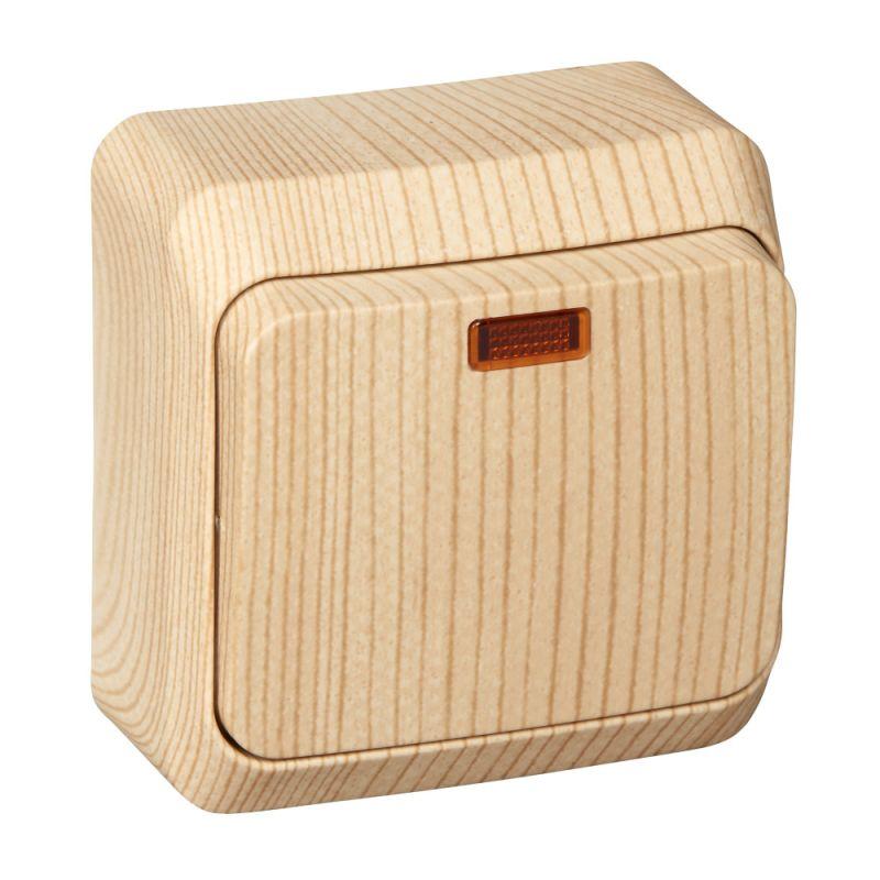 Выключатель открытой установки Systeme Electric Этюд Дача с подсветкой — это надежное и стильное решение для управления освещением в загородных домах, дачах, мастерских и других объектах, где требуется электромонтаж без скрытой проводки. Изделие выполнено в уникальном дизайне «сосна», который воспроизводит натуральную текстуру дерева, добавляя интерьеру тепла и уюта.
