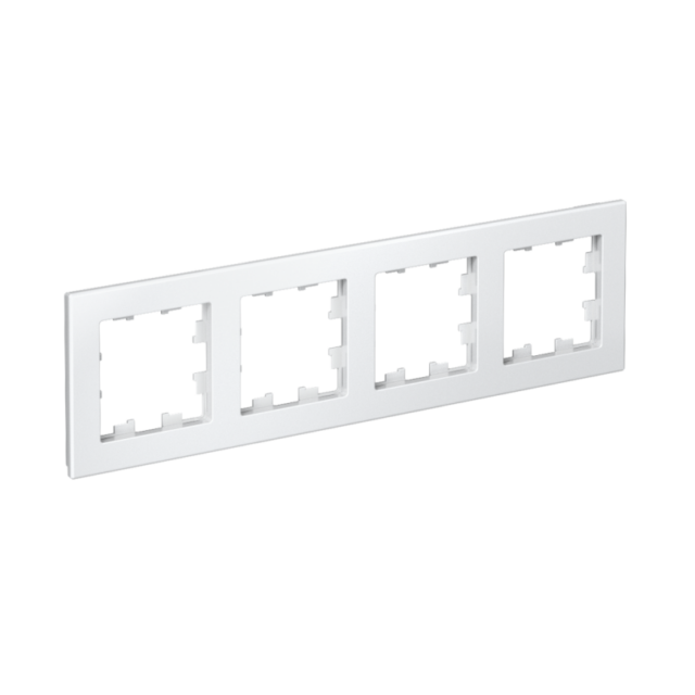 Рамка предназначена для скрытого монтажа и позволяет установить до четырёх электроустановочных изделий (розеток, выключателей) в один ряд. Её универсальность подчёркивается возможностью монтажа как в горизонтальной, так и в вертикальной ориентации, что предоставляет гибкость при планировании электропроводки в жилых, офисных и коммерческих пространствах.